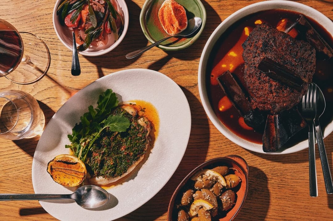 At the centre of the kitchen is a wood-fired grill and oven, where seafood, meats and vegetables are cooked simply and with care. The menu draws on the vibrant cuisines of Greece, Cyprus, Turkey and Lebanon, with dishes that are generous and made to share — from warm hummus with green zhoug and pickled watermelon with raw tuna to whole roasted John Dory with chermoula and pomegranate-glazed lamb shoulder.