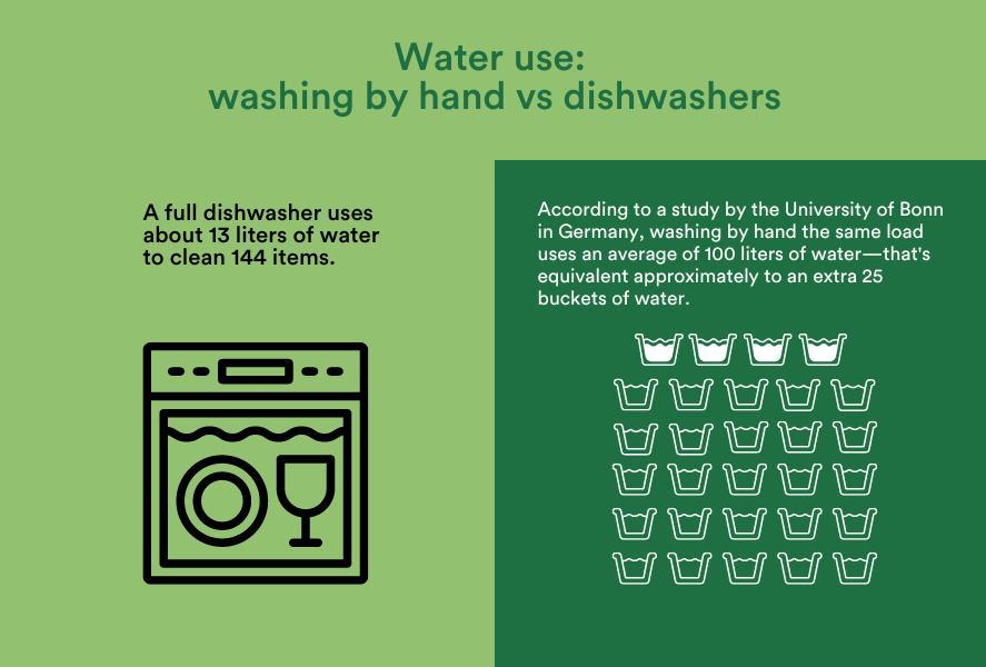 To get you started, perhaps consider using the dishwasher instead of washing by hand. Why? We'll let our little infographic below do the talking...